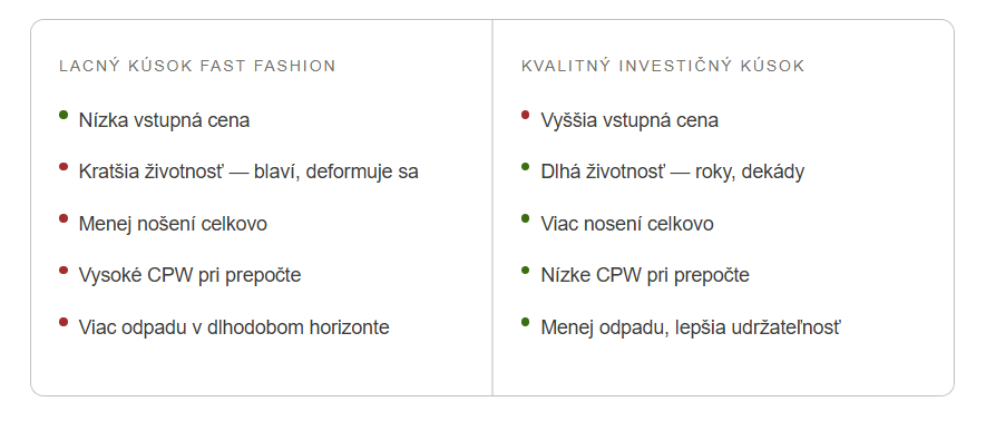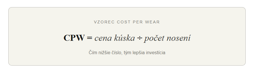 Na prvý pohľad triviálne. No v praxi tento jednoduchý vzorec odhalí zaujímavé paradoxy: tričko za 8 € oblečené trikrát a vyhodené má CPW 2,67 €. Vlnený kabát za 280 €, ktorý nosíš každú zimu štyri roky, má CPW menej ako 2 €. Kto je teraz skutočnou investíciou?