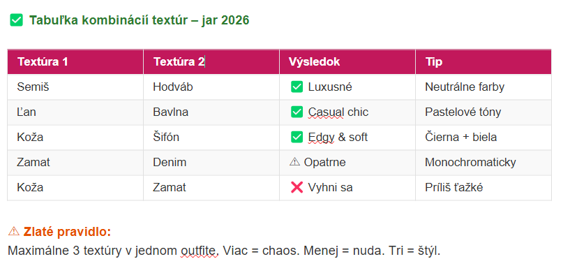 - Miešaj textúry s farebnou harmóniou (max. 3 na outfit)